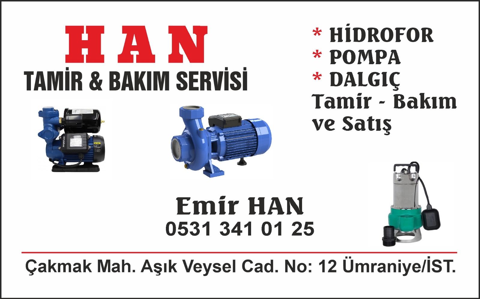Han Pompa olarak İstanbul genelinde su pompası, hidrofor, dalgıç pompa ve havuz pompası tamiri, bakımı, servisi ve satışı alanlarında profesyonel hizmetler sunuyoruz. Yılların verdiği tecrübe ve uzman ekibimizle, her ihtiyaca uygun kaliteli çözümler üretiyoruz.